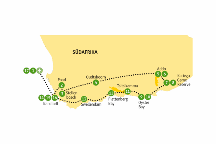 Genau genommen müsste es Big Fifteen heißen, denn zu den fünf Stars der Tierwelt kommen die seligen Weinlagen von Paarl, die berühmte Route 62, die schönste Stadt in der schönen Karoo, das Straußeneldorado Oudtshoorn, der Addo- Elephant-Nationalpark, die Safari-Abenteuer im Kariega Game Reserve, die äußerst schmackhafte Oyster Bay, der Wunderwelten-Nationalpark Tsitsikamma, das Badewasser der Plettenberg...