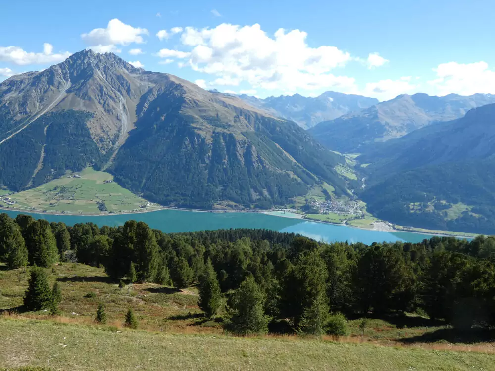 Mit der Schönebenbahn fahren wir zur Bergstation und fädeln dort in einen fantastischen Panoramaweg ein. Zu unseren Füßen glitzert der Reschensee, am Horizont leuchten die Eisriesen der Ötztaler Alpen und des Ortlermassivs in der Sonne. Von der Haideralm lockt ein Abstecher zum atemberaubenden Ausblick auf die Ortlergruppe oberhalb des Grünsees (2.475 m). Dann fahren wir mit der Seilbahn ins Tal – ein herrlicher Tag (GZ: 4 1/2 Std., + 700 m, - 650 m).