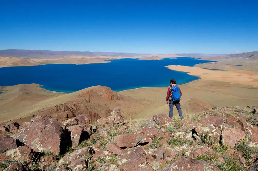 Wir schultern unsere Rucksäcke und wandern am Seeufer entlang, bis wir den ersten Sanddünen-Streifen erreichen. Dieser schiebt sich weit in das smaragdgrüne Wasser hinein und bildet an seinem Ende einen wunderschönen Badeplatz – den lassen wir uns nicht entgehen! Nach einer ausgiebigen Badepause wandern wir über die Dünen und am Seeufer entlang zum Camp zurück. Jurtenübernachtung. (F, M, A)