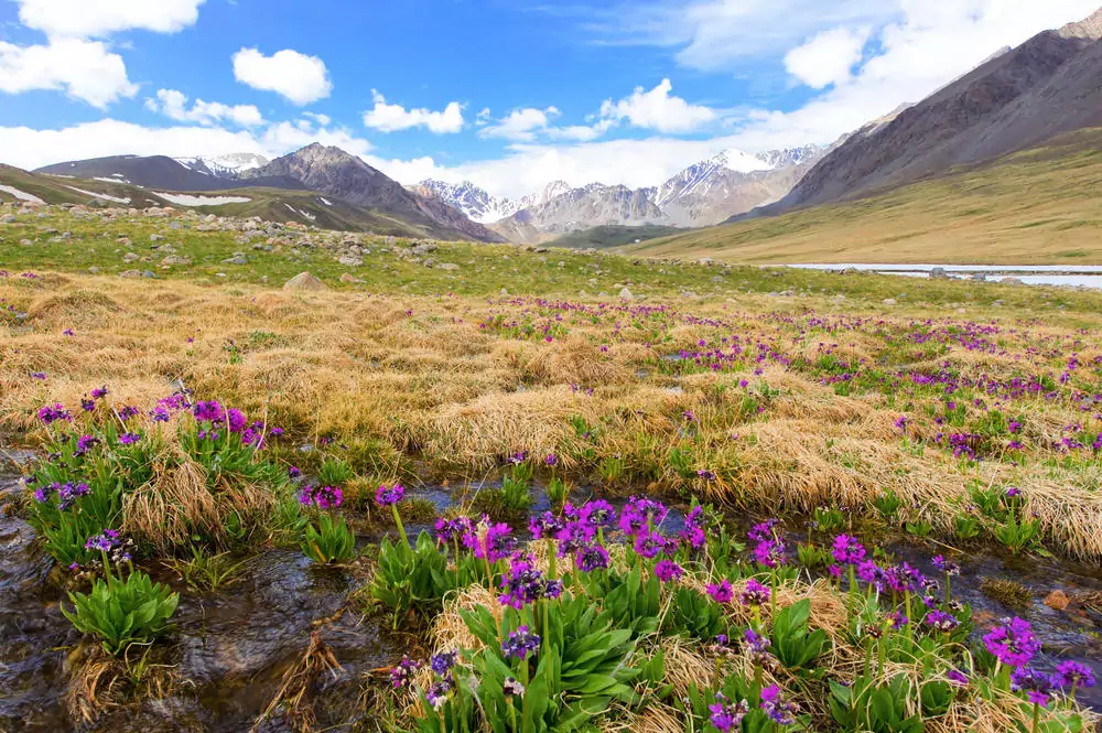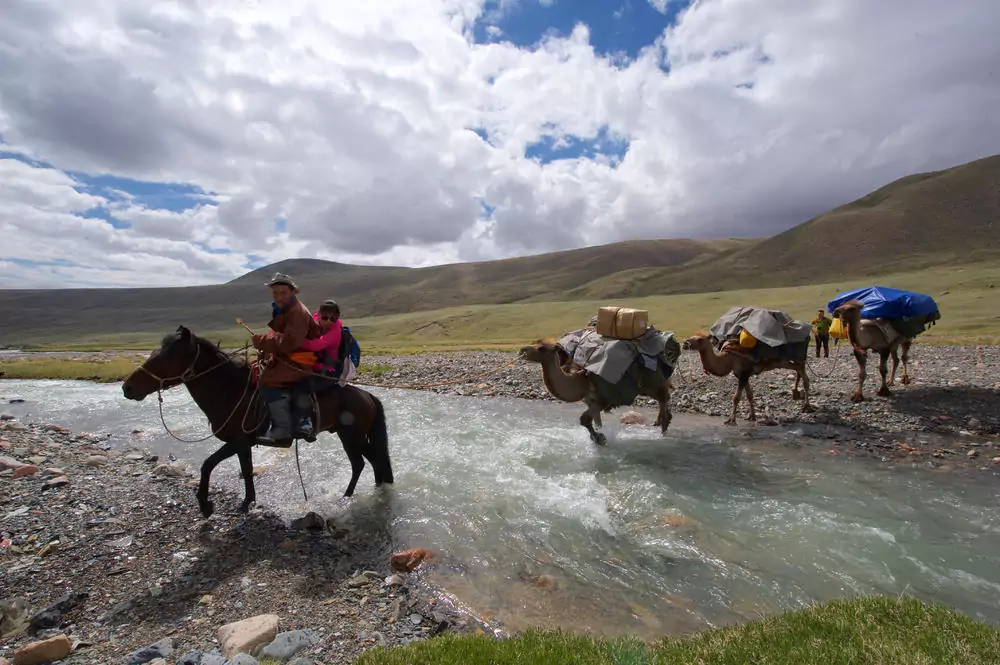 Das Gepäck wird auf die Lasttiere verladen und wir begeben uns für die nächsten vier Tage in die Wildnis des Turgen-Gebirges. Nun schlängelt sich der Pfad zu einem Pass, der uns erahnen lässt, welche Landschaft uns in den nächsten Tagen erwartet: weite Gebirgstäler von sanften Hügeln umgeben, dahinter ragen die Turgen-Eisriesen in den Himmel. Im leichten Auf und Ab wandern wir zum nächsten Pass, von dem wir schon unser Etappenziel sehen: ein Dutzend Nomaden-Gers in einem wahrhaftig idyllischen Fleckchen Erde. GZ 6 - 7 Std., +450 m, -600 m. Wir schauen bei unseren Gastgebern auf ein Glas Milchtee vorbei, lauschen den Geschichten aus ihrem Alltagsleben. (F, M, A)