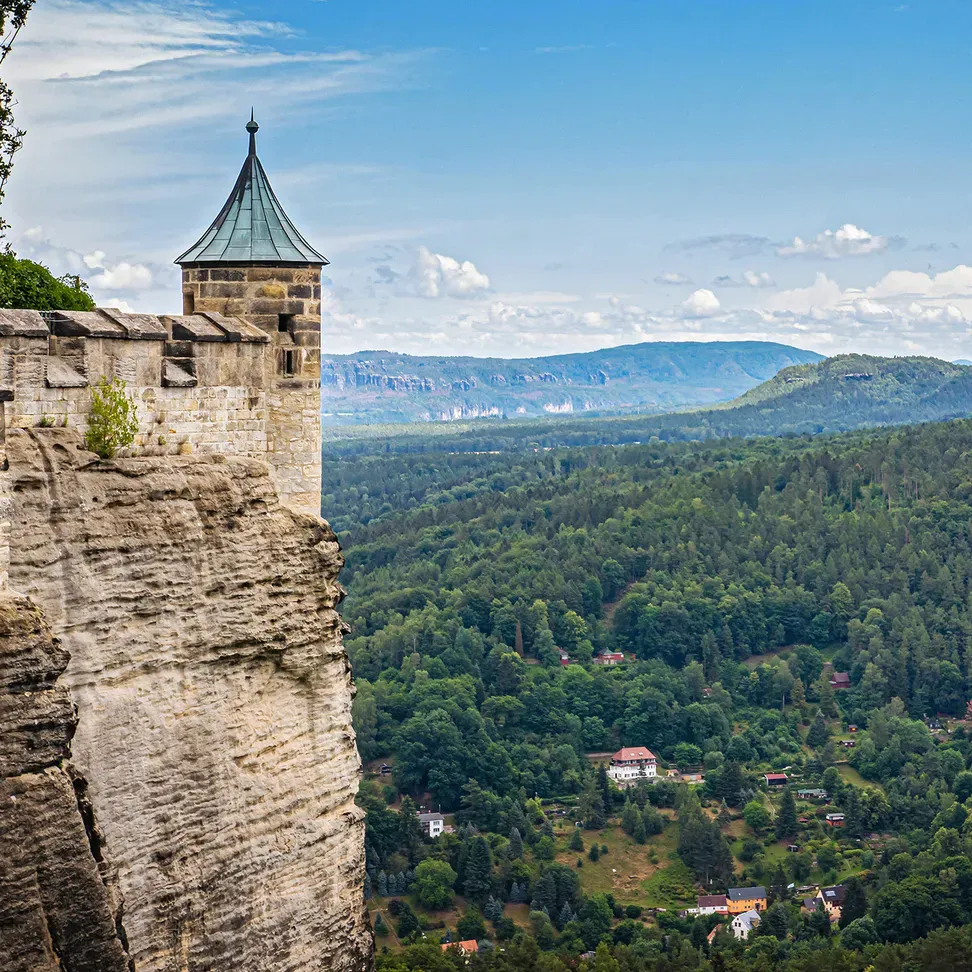 Die letzte Etappe führt Sie auf steilen Stufen durch das Felsloch Nadelöhr auf den Pfaffenstein. Der Aussichtsturm bietet Ihnen grandiose Panoramablicke. Entlang von Stegen kommen Sie zur Barbarine, dem Wahrzeichen der Region. Vorbei an der Diebeshöhle geht es nach Königstein, wo der Aufstieg zu Burg, der größten Festungsanlage Europas, lohnt. Ihre Route endet am Schloss Thürmsdorf von wo aus Sie mit den öffentlichen Verkehrsmitteln zurück in Ihr Hotel gelangen. Hotelbeispiel: Parkhotel Margaretenhof Gehzeit 5,5 h; Strecke 18 km; Auf/Ab 700/850 HM