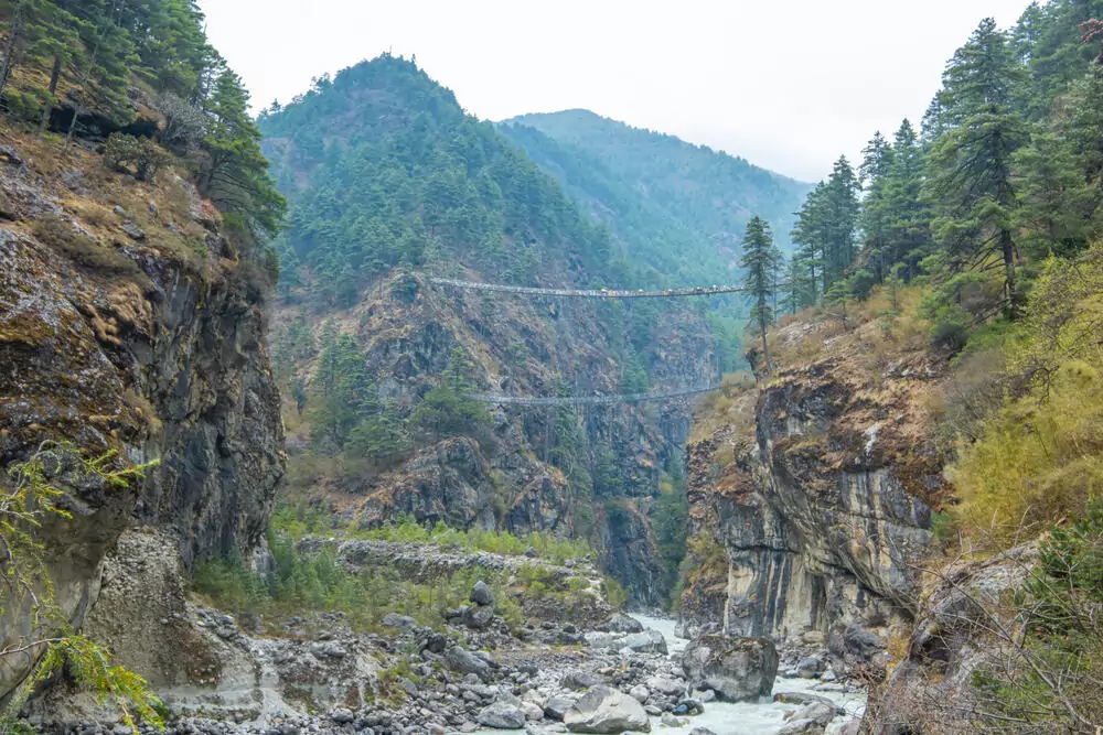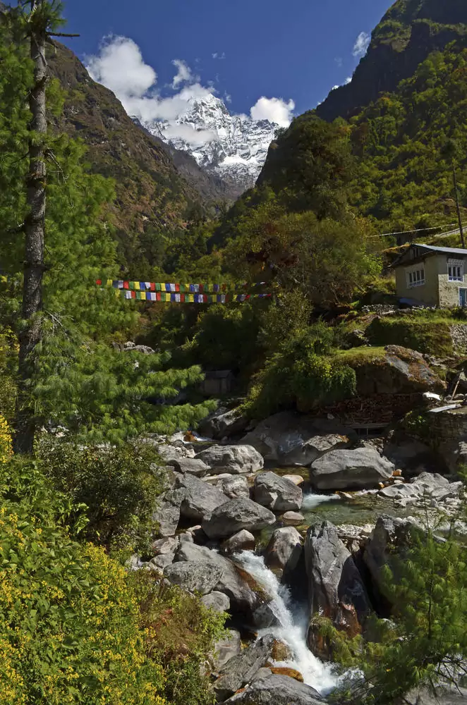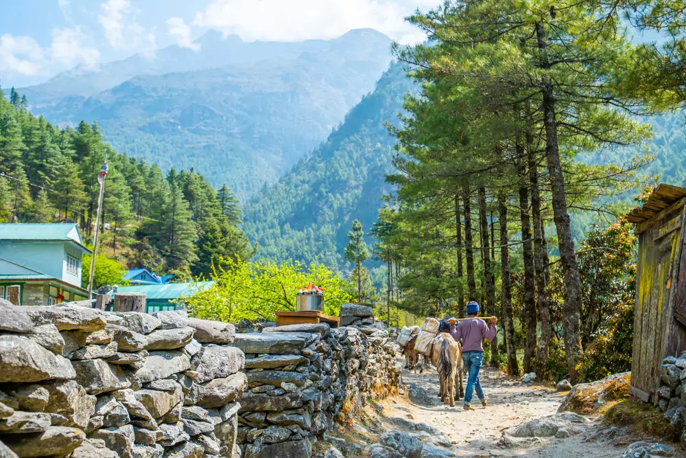 Wir folgen dem Ufer des Wildwasserflusses Dudh Koshi, der aus den Höhen des Himalaja entspringt und weit hinab bis zum heiligen Ganges fließt. Am Nachmittag beginnen wir den Aufstieg nach Namche Bazar. GZ ca. 6 Std., +950 m, -100 m. Vor uns erstreckt sich das „Dach der Welt“. Bei guten Bedingungen bietet sich uns eine fantastische Sicht auf den mächtigen Mount Everest (8.848 m), sowie die beeindruckenden Berge Lhotse (8.516 m) und Nuptse (7.861 m). 2 Lodgeübernachtungen in Namche Bazar. (F, A)