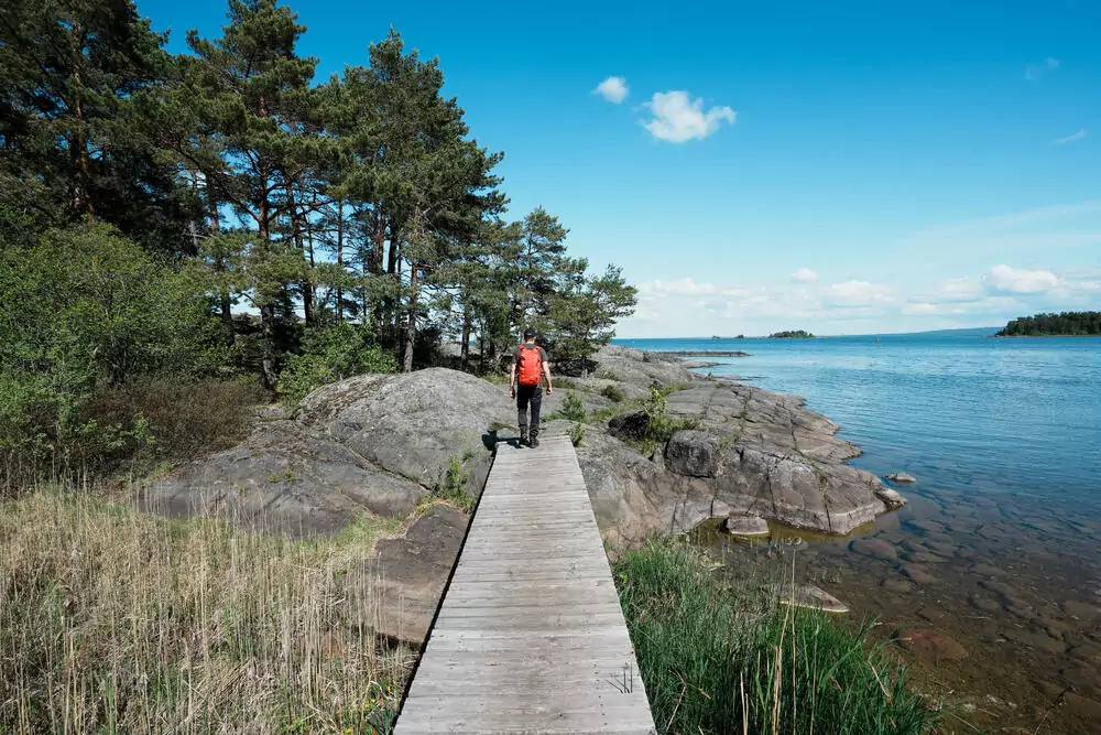 Eine kurze Busfahrt bringt uns zur Ullereds-Brücke, dem Tor zur Insel Kållandsö. Wir wandern durch uralte Eichenwälder, stille Heideflächen und vorbei an typisch schwedischen Holzhäuschen. Ziel ist Spiken, ein malerisches Fischerdorf am Vänernsee (GZ: 3 1/2 Std., geringe Höhenunterschiede). Hier wartet eine lokale Stärkung auf uns: fangfrischer Fisch! Der Vänernsee wirkt hier klein und ruhig – eine geschützte Bucht, ideal für die Fischer, deren Boote hier bei jedem Wetter einen sicheren Hafen finden.