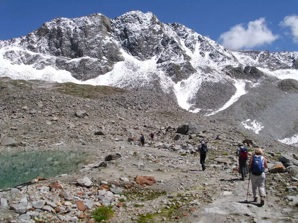 Fahrt mit dem Postbus nach Mittelberg. Hier beginnt der Aufstieg zur Braunschweiger Hütte (2.759 m), und weiter zum höchsten Punkt unserer Alpenüberquerung, dem Rettenbachjoch (2.996 m, bei gutem Wetter ggf. über das Pitztaler Jöchl). Über den Rettenbachferner steigen wir zur Gedenkkapelle und zum Parkplatz der Gletscherbahn ab. Transfer nach Sölden (1 Ü; GZ: 5 1/2 Std., + 1.250 m, - 400 m).