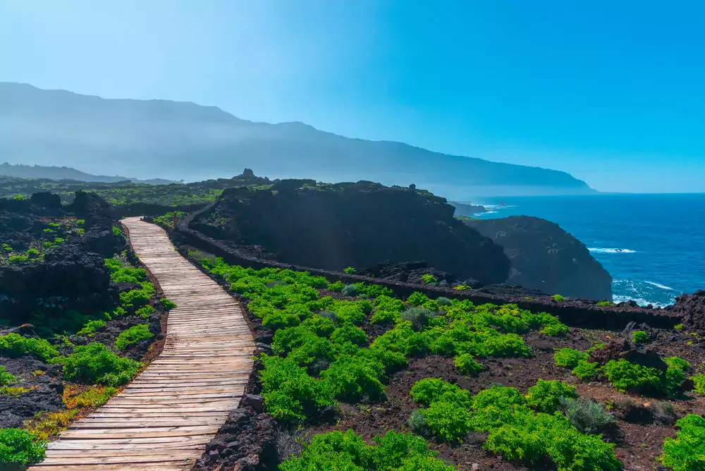 Lava, Wind und Meer prägen die raue Küstenlandschaft. Felsbögen und eine sagenumwobene Heilquelle machen die Wanderung zu einem besonderen Erlebnis zwischen Naturgewalt und Ruhe. Wer genau hinschaut, entdeckt Spuren alter Wege von Fischern und Hirten (GZ: 4 Std., - 280 m).