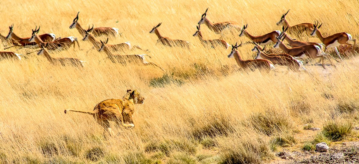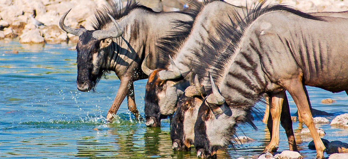 In morgendlicher Stille erlebst du den Wildpark, in dem auch Breitmaul- und Spitzmaulnashörner leben, hautnah. Zu Fuß erkundest du gemeinsam mit deiner Reiseleitung in ca. anderthalb Stunden das Gelände und beobachtest Antilopen und Zebras. Anschließend geht es in den berühmten Etosha-Nationalpark, wo du mit etwas Glück Elefant, Springbock, Oryxantilope, Giraffe, Löwe und Nashorn beobachtest. Auf ausgedehnten Beobachtungsfahrten bekommst du erste Eindrücke von der Tiervielfalt der Region. Erst kurz vor Sonnenuntergang verlässt du den Park.
