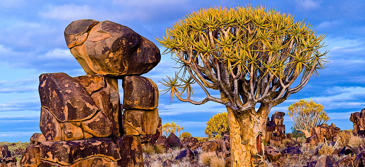Auf dem Farmgelände des Mesosaurus Fossil Camp gibt es rund 5.000 Köcherbäume. Farminhaber Giel Steenkamp erklärt bei einem Rundgang die Mesosaurus-Fossilien und zeigt dir auch den farmeigenen Köcherbaumwald, der eine imposante Sammlung von Aloe dichotoma aufweist. Staune über die »singenden Steine«, eine Sammlung interessanter Doleritformationen. Auf der anschließenden Fahrt siehst du die roten Kalahari-Dünen und wir geben dir natürlich Gelegenheit auszusteigen und Fotos zu machen.