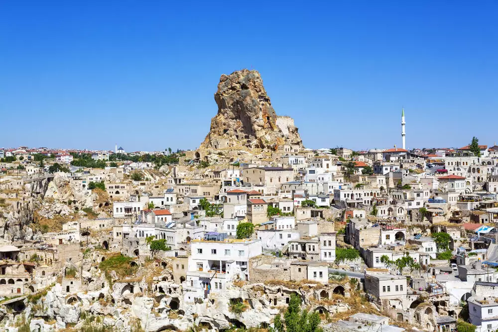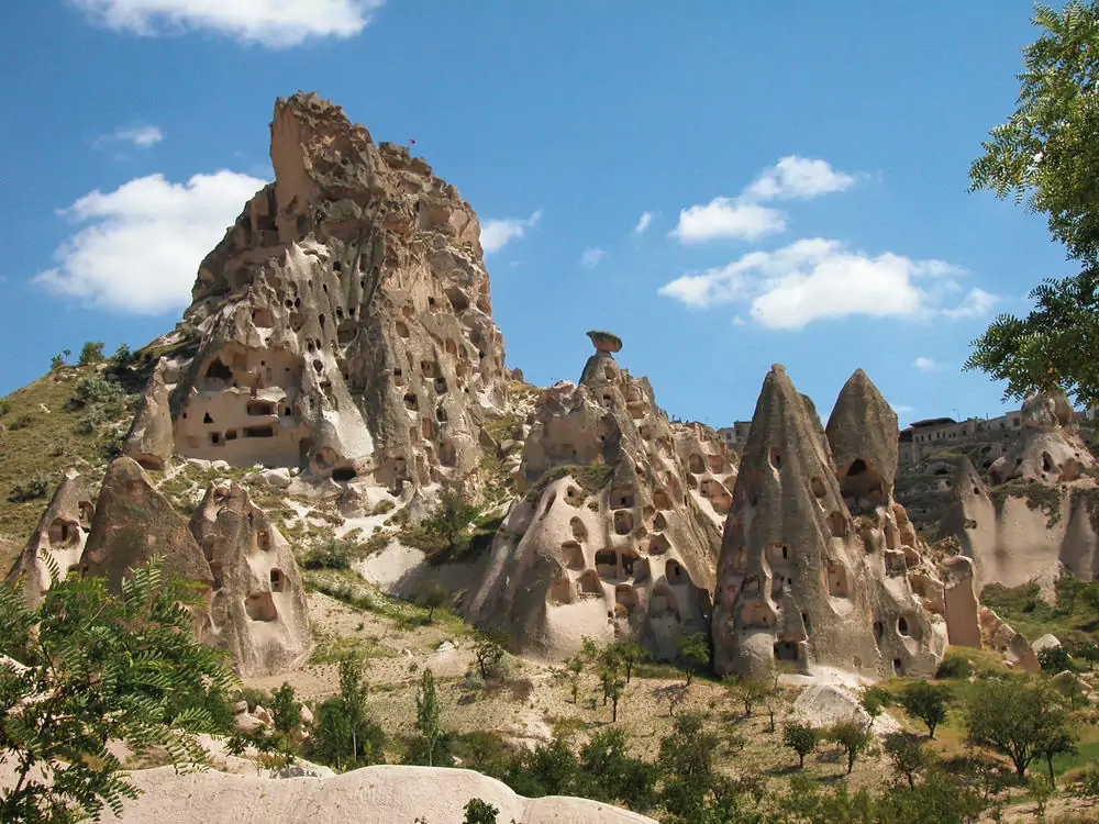 Am Morgen besteigen wir über Innen- und Außentreppen den 60 m hohen Felsenkegel von Uchisar. Unsere Wanderung im zauberhaften Tal der Tauben endet im Freilichtmuseum von Göreme (UNESCO-Weltkulturerbe). Wir besichtigen die in Tuffstein gehauenen Kirchen aus byzantinischer Zeit (GZ: 3 Std., - 120 m). Sie sind teils reich mit Malereien verziert und umringt von Feenkaminen.