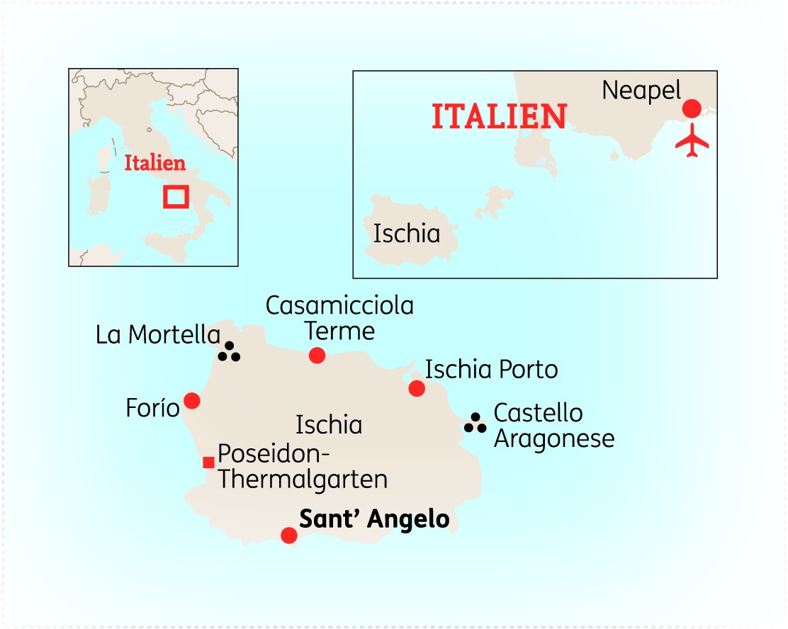 Lassen Sie sich auf dieser 8-tägigen Reise von der grünen Perle im Golf von Neapel verzaubern! Die Insel Ischia empfängt Sie mit blumenumsäumten Hügeln, Pinienwäldern und herrlichen Sandstränden. Zugleich lädt die Mittelmeerinsel sowohl Erholungssuchende als auch Naturfreunde und Kulturinteressierte ein, sie zu erkunden. Durch ihren vulkanischen Ursprung hat Ischia viele natürliche Thermalquellen, die rund um die Insel verteilt sind – freuen Sie sich auf Urlaub der ganz besonderen Art.