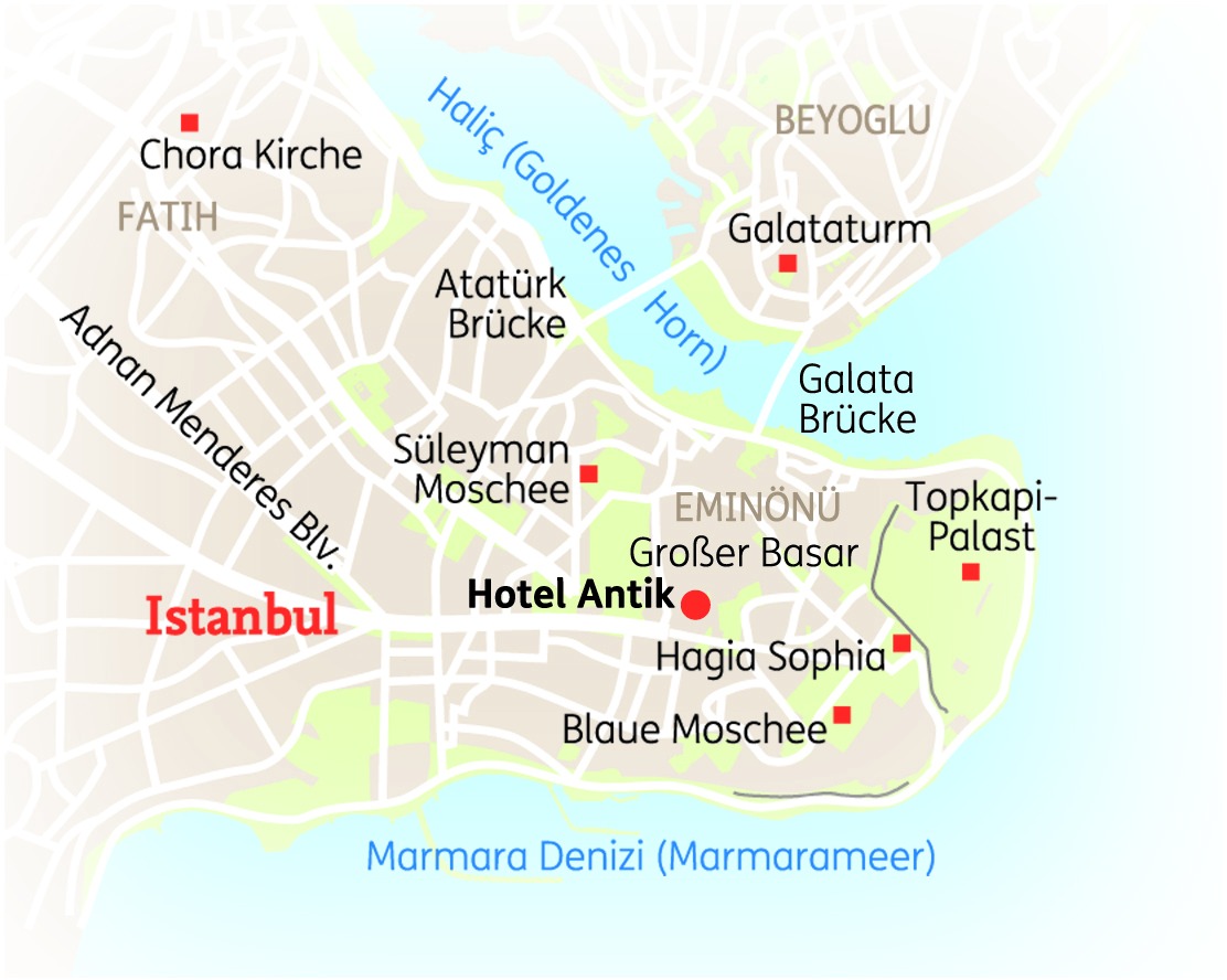 Inmitten Istanbuls Altstadt empfängt Sie das 4-Sterne-Hotel Antik mit einer 24-Stunden-Rezeption. Sie erwartet nicht nur ein modern eingerichtetes Hotel, sondern auch eine Unterkunft mit idealer Lage als Ausgangspunkt für Ihre Erkundungen. Die 80 Zimmer verteilen sich auf vier Etagen und sind über einen Aufzug erreichbar. Jedes der hell und freundlich eingerichteten Zimmer verfügt über Sat.-TV, Klimaanlage, Safe, Sitzmöglichkeiten, Fön und kostenloses WLAN. Unter dem Hotel befindet sich die 1500 Jahre alte Zisterne, die Sie kostenlos besuchen können. Entdecken Sie die vielen Kulturgeheimnisse Istanbuls. Die Blaue Moschee und der Topkapi-Palast sind fußläufig erreichbar. Statten Sie auch dem versunkenen Palast und der Hagia Sophia einen Besuch ab, oder genießen Sie Ihre Freizeit am großen Basar. Wenn Sie auswärts essen gehen möchten, liegen viele verschiedene Restaurants in der näheren Umgebung. Verpflegung: Am Morgen genießen Sie das reichhaltige Frühstück in Buffetform. Am letzten Abend speisen Sie in einem traditionellen Spezialitätenrestaurant der Stadt.