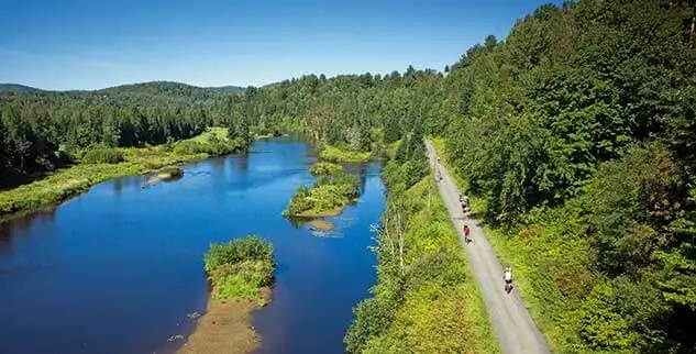 Bis in die 60er-Jahre brachte der kleine Zug des Nordens Touristen vom nahegelegenen Montreal in die Laurentides, eine Landschaft nördlich von Montreal. Heute ist die Eisenbahnstrecke ein Fahrradweg und ein Paradies für Radler. Wir radeln auf meist ebener und leicht gewellter Strecke durch urwüchsige Landschaft, umgeben von Wäldern, Wasser und Bergen. Kleine Ortschaften und romantisch restaurierte Bahnstationen laden zur Kurzweil ein: zu einem Kaffee oder zu einer Ausstellung und natürlich zu einem reichhaltigen Mittagstisch. Am Nachmittag erreichen wir unser Tagesziel Val-Morin. Hier siedelten die ersten Europäer um 1769 und sie sind stolz auf ihre Traditionen.