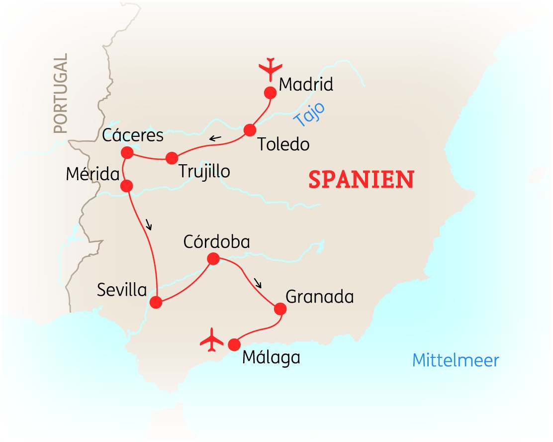 Auf Ihrem Weg von Kastilien in die Region Extremadura und weiter nach Andalusien erleben Sie die spanische Hauptstadt Madrid und die historisch bedeutenden Städte Toledo, Mérida, Sevilla, Córdoba und Granada. Die 10-tägige Reise, die Sie durch eine Landschaft mit großer Weite, in eine unentdeckte Region mit grünen Wiesen und sanften Bergen und schließlich in das kulturelle Herz Spaniens führt, vermittelt Ihnen einen intensiven Einblick in die Kultur, Geschichte und Kulinarik der Regionen.