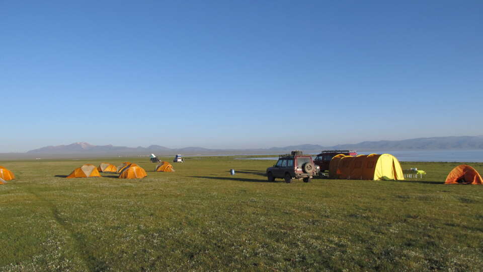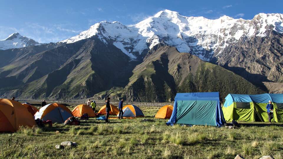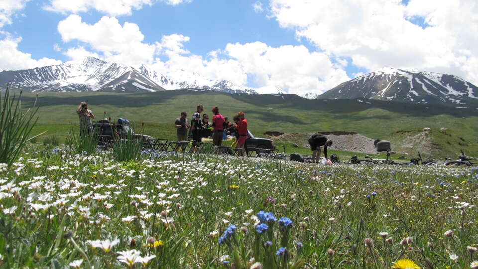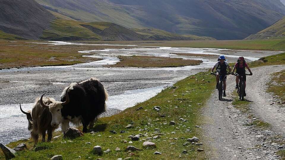 Nach dem Frühstück beginnt unsere erste Bike-Etappe und führt uns die Straße entlang Richtung Karakolpass (3485 m). Die Karakolschlucht ist eine sehr schöne und malerische Region mit unterschiedlicher Flora. Wir fahren größtenteils auf Schotterwegen. Inmitten dieser markanten Landschaft werden wir bei einer Mittagsrast mit Kaffee, Tee, frischen Früchten und einer kleinen Mahlzeit versorgt. Am Ende unserer Etappe errichten wir unsere Zelte und genießen den Tagesausklang umrahmt von vier- bis fünftausend Meter hohen Gipfeln.