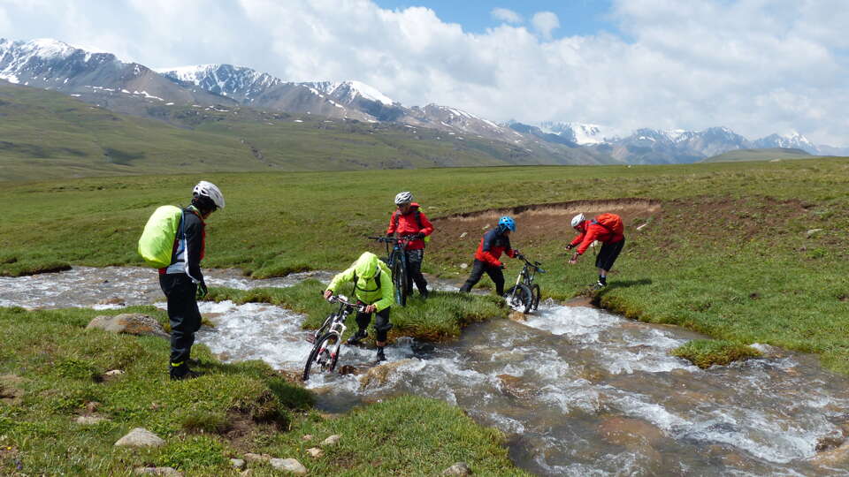 Je nach Wasserstand queren wir auf unserer Tour immer wieder Bäche und Flussläufe und sollten dafür gerüstet sein. Radschuhe und Socken aus, Sandalen oder Neoprenschuhe an, Bike schultern und durch¿ Allmählich bekommen wir Übung. Der Weg auf Schotterpisten ist zunächst gut fahrbar, je höher wir heute kommen, um so rauer, steiler und steiniger wird der Weg. Wir sind unterwegs zum Tosor-Pass, den wir heute aber noch nicht ganz erreichen.