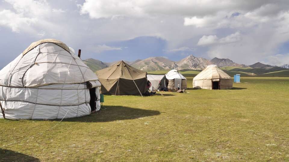 Morgens packen wir die Bikes und starten unseren Transfer in Richtung Son-Kul-See über den Teuz-Ashu-Pass (3229 m). Am Weg genießen wir einen großartigen Panoramablick. Ringsum befinden sich beeindruckende Gebirgszüge und grüne weitläufige Wiesenflächen. Schließlich erreichen wir den Song-Kul-See, der auf einer Höhe von 3016 m liegt und mit 29 km Länge, 18 km Breite und einer maximalen Tiefe von 13 m den zweitgrößten See Kirgistans bildet. Seine herrliche Lage in einem baumlosen Hochgebirgstal des Inneren Tien Shan Gebirges, umgeben von bergigen Hochebenen, bietet ein wunderschönes Panorama. Seine Schönheit ist berühmt und wurde oft in traditionellen Liedern besungen. In den umliegenden Bergwiesen weiden die Nomaden, die in den typischen weißen Jurtencamps im Einklang mit der Natur leben, im Sommer ihre Herden. Hier haben wir Gelegenheit, die Tradition der Bewohner etwas näher kennen zu lernen. Heute übernachten wir in Jurten mit Möglichkeit zu heißer Dusche.