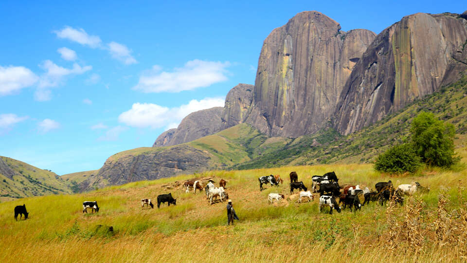 Nach dem Frühstück wandern wir auf einem leicht auf- und absteigenden Schotterweg talauswärts nach Vohitsaoka, wo wir wieder auf unser Fahrzeug treffen und in Richtung Süden fahren. Die steppenartige Landschaft ist im Vordergrund von riesigen, teils abgerundeten, teils verwitterten Felsformationen geprägt, im Hintergrund thront weiterhin das Andringitra-Gebirge, das gegen Osten in den Regenwald übergeht. Allmählich werden die Berge niedriger, die Savannenlandschaft weiter, die Häuser kleiner - wir kommen ins Land der Bara, der Hirten und Halbnomaden. Nach Ihosy steigt die Straße bis zum Horombe-Plateau hinauf. Soweit das Auge reicht, führt sie durch Steppe und Viehweiden, bis das Isalo-Gebirge sichtbar wird und wir am Nachmittag in Ranohira ankommen. Das Abendessen findet im Hotel statt.