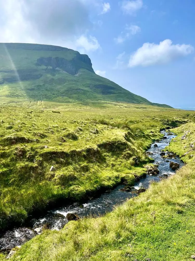 Am Fuße des markanten Benbulben unternehmen wir eine Rundwanderung mit eindrucksvollen Ausblicken auf den Tafelberg und die umliegende Landschaft. Anschließend besuchen wir den Devil’s Chimney, einen Wasserfall, der bei starkem Wind seine Fließrichtung ändern kann – ein besonderes Naturphänomen zum Abschluss unserer Reise (GZ: 3 Std., +/- 100 m).