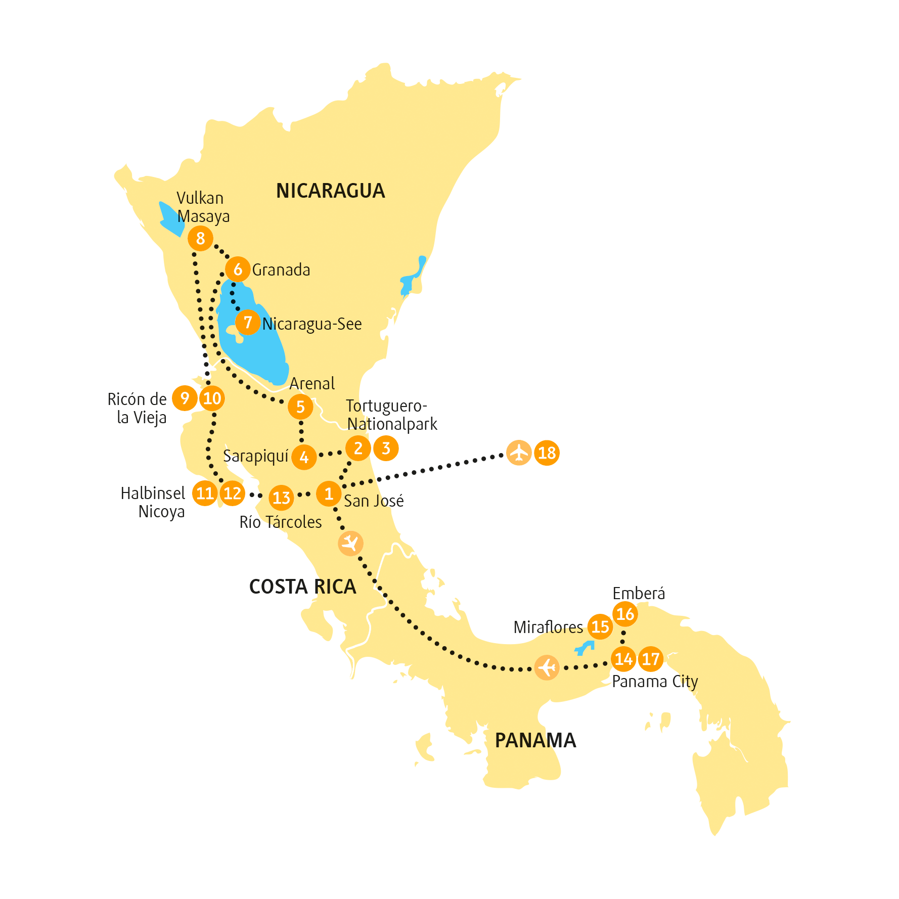Bei Buchung mit Anreise in Eigenregie sind der Linienflug, Rail&Fly und die Flughafentransfers nicht in den Leistungen enthalten. Falls einzelne der genannten Unterkünfte nicht verfügbar sind, wird eine möglichst gleichwertige Alternative gebucht. Bei den angegebenen Fahrzeiten handelt es sich um die reine Fahrtdauer. Pausen und Fotostopps bleiben unberücksichtigt. Während deiner Rundreise passierst du die Grenzen zwischen Costa Rica und Nicaragua auf dem Landweg. Insgesamt fallen dafür ca. 25 USD pro Person an. Wir empfehlen dir die Gebühr an den Grenzen in kleinen Scheinen bereit zu halten. Auf unseren Reisen nutzen wir eine Vielzahl unterschiedlicher Transportmittel und Unterkünfte. Wir können dabei keine durchgehende Barrierefreiheit garantieren, so dass unsere Reisen im Allgemeinen nicht für Menschen mit eingeschränkter Mobilität geeignet sind. Wir beraten dich gern zu deinen Bedürfnissen und deinem gewählten Reiseziel.