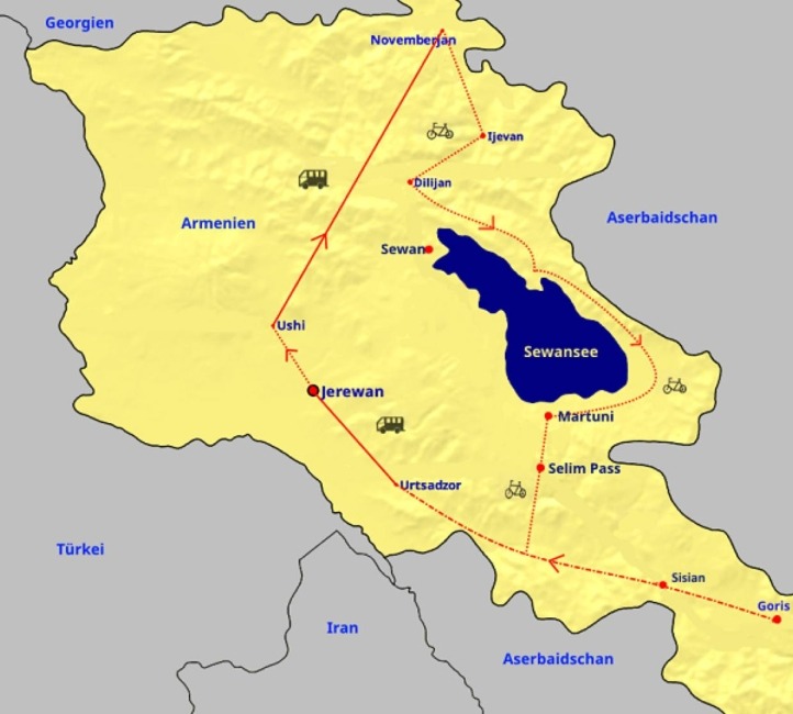 In Tagesetappen von 25 bis 75 km führt unsere Radreise durch üppige Bergregionen, über grüne Hügel, durch karge, steppenartige Landschaften, entlang dem Ufer des Sewansees, zu einer mythischen Kultstätte und in traditionelle Dörfer. Es gibt zahlreiche Gelegenheiten, die berühmte lokale Gastfreundschaft und den wunderbaren Sonnengeschmack der armenischen Küche kennen zu lernen.