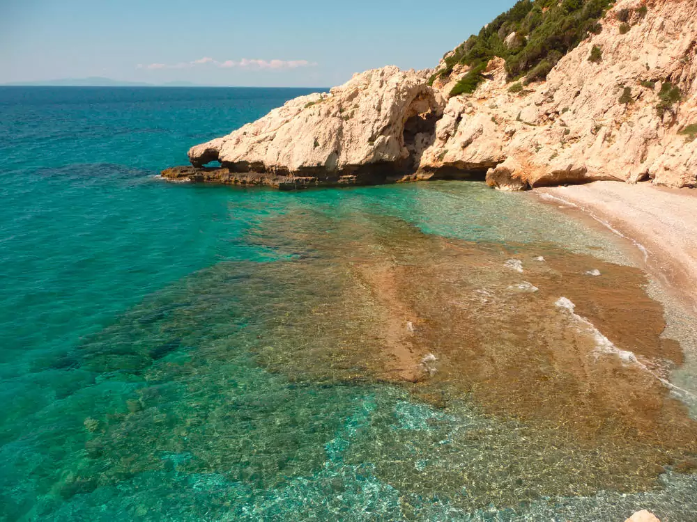 Durch dschungelartige Vegetation verläuft unser Weg durch eine Schlucht hinauf zum Dorf Tsourlei. Der Waldpfad endet beim Dorf Nikoloudes, bevor es immer bergab geht mit wunderbaren Blicken über die Nordwestküste, die wir schließlich bei den beiden traumhaften Buchten Megalo und Mikro Seitani erreichen (GZ: 5 Std., +/- 450 m).